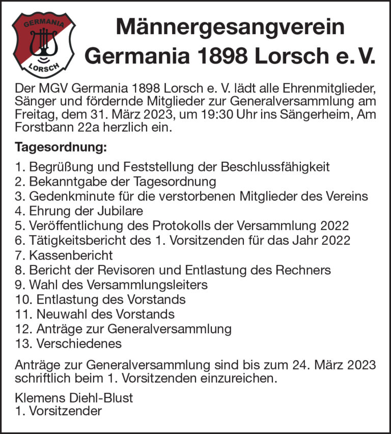 Marga Geridant, Yannick Schmitt Der Männergesangsverein Germania Lorsch durchläuft ein besonderes Vereinsjahr, das 125zigste. Was 1898 begann, hat heute immer