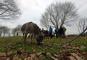 Im Verlauf der Wanderung hatte sich die Zahl der Grenzgänger indes vergrößert, waren doch noch drei Esel geführt von Gerda Brunnengräber und ihrer Tochter hinzugestoßen. Auch die Grautiere waren für jeden Halt, bei dem die Gruppe sich wieder versammelte, dankbar, konnten sie diese Stopps doch nutzten, um genüsslich an den Gräsern des Lorscher Bruchs zu rupfen.