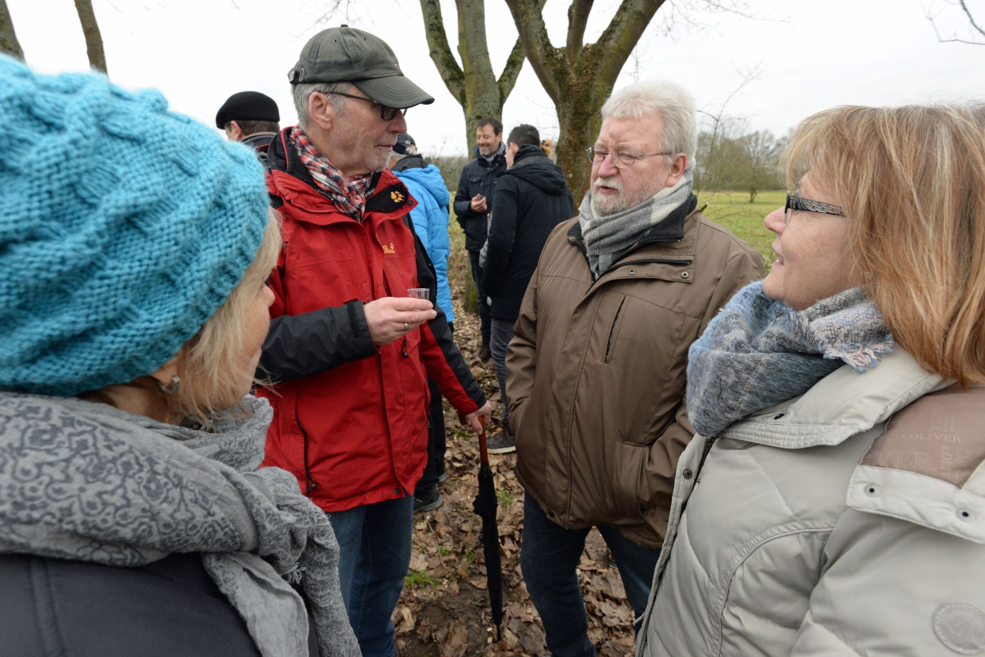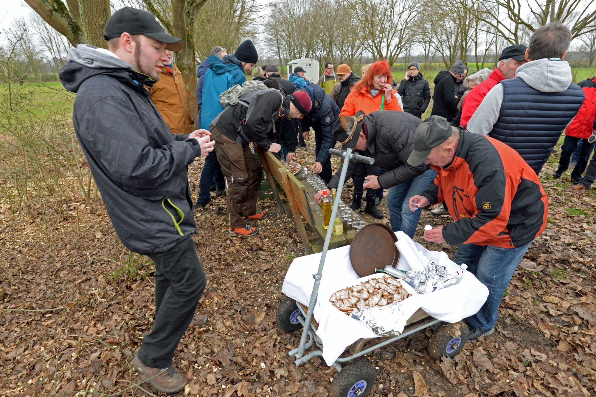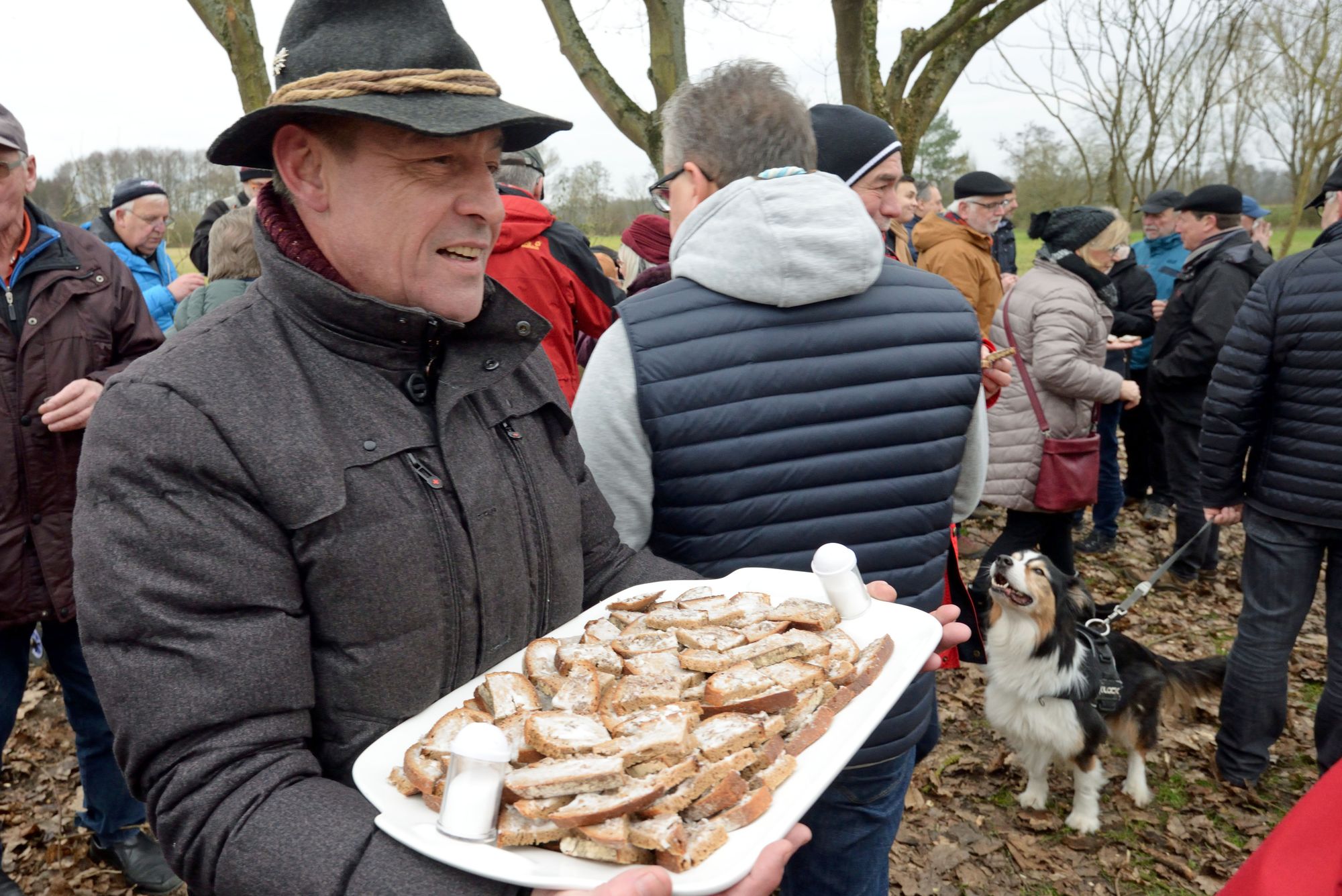 Dem Bollerwagen folgend – dessen Inhalt eine hochprozentige Aufwärmung sowie eine kleine Stärkung in Form von Schmalzbroten versprach – brach die Gruppe in Richtung der Baden-Württembergischen Landesgrenze auf. Bei Plaudereien über das Gestern und Heute in Lorsch, Erinnerungen an manches Erlebte, wie das Schlittschuhlaufen auf den Weschnitzauen, war der bedeckte, graue Himmel der guten Stimmung nicht abträglich.