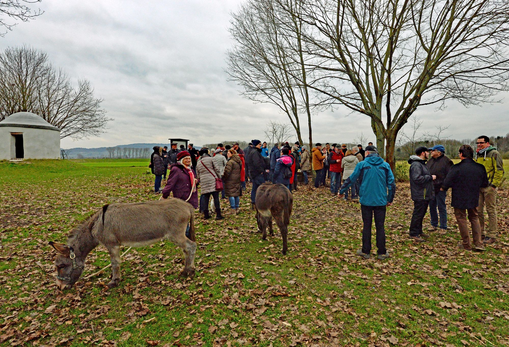 Im Verlauf der Wanderung hatte sich die Zahl der Grenzgänger indes vergrößert, waren doch noch drei Esel geführt von Gerda Brunnengräber und ihrer Tochter hinzugestoßen. Auch die Grautiere waren für jeden Halt, bei dem die Gruppe sich wieder versammelte, dankbar, konnten sie diese Stopps doch nutzten, um genüsslich an den Gräsern des Lorscher Bruchs zu rupfen.