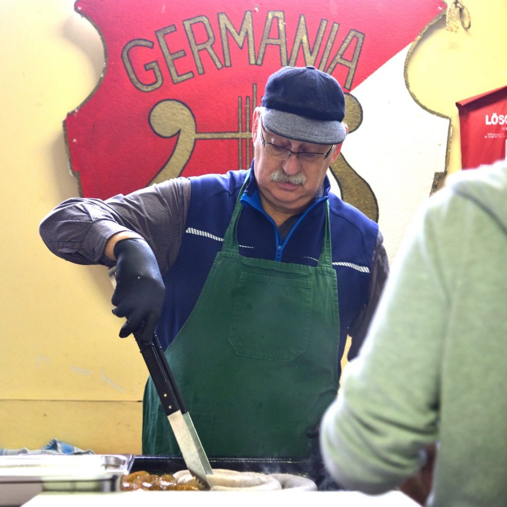 In diesem Jahr übernehmen Andreas Volk und Bernd Wohlfart wieder die Metzgerarbeit und bereiten nach alten Germania-Rezepten für das Schlachtfest Bratwurst, Blut- und Leberwurst sowie Schwartemagen zu. Die bestellte Wurstware kann während des Schlachtfests abholen werden. Wer mag, kann dann bereits vor Ort eine Kostprobe zu sich nehmen. Blut- und Leberwurst vereinen sich beispielsweise auf Sauerkraut mit Wellfleisch – auf Wunsch zusätzlich mit ‚Nierchen‘ – zu einem ‚Schlachtteller‘. Das Wohl der Gäste ist Germania ein besonderes Anliegen. Und so werden zahlreiche Helfer in Geschirrküche, am Herd, im Ausschank und der Bedienung für einen guten Service und beste Stimmung sorgen. Einen kleinen kulinarischen Höhepunkt wird es zusätzlich geben, denn Vorstandsmitglied Marion Leidner hat ein besonderes Angebot vorbereitet: Bretzenknödel, eine sehr beliebte Beilage, und für Wurst- und Fleischskeptiker eine schmackhafte Alternative.